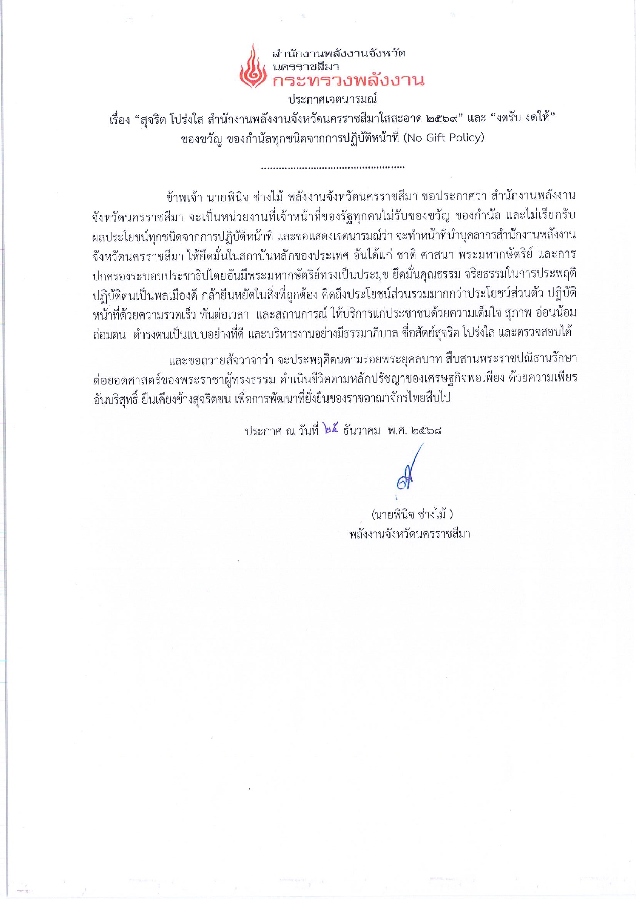 สำนักงานพลังงานจังหวัดนครราชสีมา งดรับ งดให้ ของขวัญ ของกำนัลทุกชนิดจากการปฏิบัติหน้าที่ (No Gift Policy)
